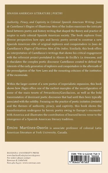Authority, Piracy, and Captivity in Colonial Spanish American Writing examines the intricate bond between poetry and history writing that shaped the theory and practice of empire in early colonial Spanish-American society. The book explores from diverse perspectives how epic and heroic poetry served to construe a new Spanish-American elite of original explorers and conquistadors in Juan de Castellanos's Elegies of Illustrious Men of the Indies. Similarly, this book offers an interpretation of Castellanos's writings that shows his critical engagement with the reformist project postulated in Alonso de Ercilla's La Araucana, and it elucidates the complex poetic discourse Castellanos created to defend the interests of the early generation of explorers and conquistadors in the aftermath of the promulgation of the New Laws and the mounting criticism of the institution of the encomienda. Within the larger context of a new poetics of imperialistic expansion, this book shows how the Elegies offers one of the earliest examples of the reconfiguration of some of the main tenets of Petrarchism/Garcilacism, as well as the bold transmutation of dominant poetic discourses that had until then been typically associated with the nobility. Focusing on the practice of poetic imitation (imitatio) and the themes of authority, piracy, and captivity, this book shows the transformation undergone by heroic poetry owing to Europe's encounter with America and illustrates the contribution of learned heroic verse to the emergence of a Spanish-American literary tradition.