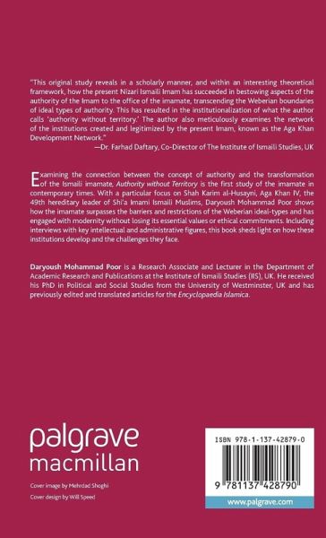 "This original study reveals in a scholarly manner, and within an interesting theoretical framework, how the present Nizari Ismaili Imam has succeeded in bestowing aspects of the authority of the Imam to the office of the Imamate, transcending the Weberian boundaries of ideal types of authority. This has resulted in the institutionalisation of what the author calls 'authority without territory.' The author also meticulously examines the network of the institutions created and legitimised by the present Imam, known as the Aga Khan Development Network." - Dr. Farhad Daftary, Co-Director of The Institute of Ismaili Studies, UK