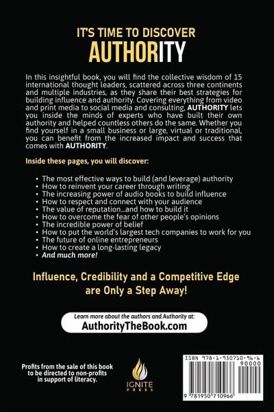 IT'S TIME TO DISCOVER AUTHORITY In this insightful book, you will find the collective wisdom of 15 international thought leaders, scattered across three continents and multiple industries, as they share their best strategies for building influence and authority. Covering everything from video and print media to social media and consulting, AUTHORITY lets you inside the minds of experts who have built their own authority and helped countless others do the same. Whether you find yourself in a small business or large, virtual or traditional, you can benefit from the increased impact and success that comes with AUTHORITY. Inside these pages, you will discover: The most effective ways to build (and leverage) authority How to reinvent your career through writing The increasing power of audio books to build influence How to respect and connect with your audience The value of reputation...and how to build it How to overcome the fear of other people's opinions The incredible power of belief How to put the world's largest tech companies to work for you The future of online entrepreneurs How to create a long-lasting legacy And much more! Influence, Credibility and a Competitive Edge are Only a Step Away!