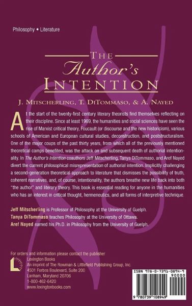 At the end of the twentieth century literary theorists find themselves reflecting on their discipline. Since at least 1969, the humanities and social sciences have seen the rise of Marxist critical theory, Foucault (or discourse and the new historicism), various schools of American and European cultural studies, deconstruction, and poststructuralism. One of the major coups of the last 30 years, from which all of the previously mentioned theoretical camps benefited, was the attack on and subsequent death of authorial intentionality. In, The Author's Intention co-authors DiTommaso, Mitscherling, and Nayed divert the current philosophical misrepresentation of authorial intention. Implicitly challenging a second-generation theoretical approach to literature that dismisses the possibility of truth, coherent narratives, and, of course, intentionality the authors breathe new life back into "the author" and, also, literary theory. This book is essential reading for anyone in the humanities who has an interest in critical thought, hermeneutics, and all forms of interpretive technique.