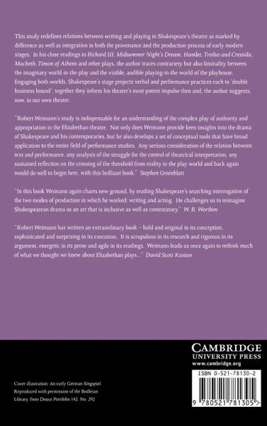 In this seminal work, Robert Weimann redefines the relationship between writing and performance, or 'playing', in Shakespeare's theatre. Through close reading and careful analysis Weimann offers a reconsideration and redefinition of Elizabethan performance and production practices. The study reviews the most recent methodologies of textual scholarship, the new history of the Elizabethan theatre, performance theory, and film and video interpretation, and offers a new approach to understanding Shakespeare. Weimann examines a range of plays including Hamlet, Troilus and Cressida, Henry V, A Midsummer Night's Dream and Macbeth, among others, as well as other contemporary works. A major part of the study explores the duality between playing and writing: the imaginary world-in-the-play and the visible, audible playing-in-the-world of the playhouse, and Weimann focuses especially on the gap between these two, between the so-called 'pen' and 'voice'.