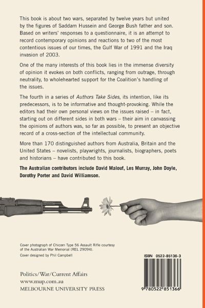 This book records the contemporary opinions and reactions of over 170 distinguished authors to two of the most contentious issues of our times, the Gulf War of 1991 and the Iraq invasion of 2003. This book is about two wars, separated by twelve years but united by the figures of Saddam Hussein and George Bush father and son. Based on writers' responses to a questionnaire, it is an attempt to record contemporary opinions and reactions to two of the most contentious issues of our times, the Gulf War of 1991 and the Iraq invasion of 2003. One of the many interests of this book lies in the immense diversity of opinion it evokes on both conflicts, ranging from outrage, through neutrality, to wholehearted support for the Coalition's handling of the issues. The fourth in a series of Authors Take Sides, its intention, like its predecessors, is to be informative and thought-provoking. While the editors had their own personal views on the issues raised-in fact, starting out on different sides in both wars - their aim in canvassing the opinions of authors was, so far as possible, to present an objective record of a cross-section of the intellectual community. More than 170 distinguished authors from Australia, Britain and the United States-novelists, playwrights, journalists, biographers, poets and historians-have contributed to this book. The Australian contributors include David Malouf, Les Murray, John Doyle, Dorothy Porter and David Williamson.