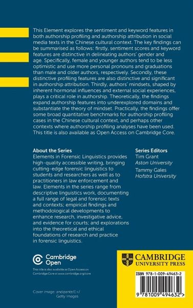 This Element explores the sentiment and keyword features in both authorship profiling and authorship attribution in social media texts in the Chinese cultural context. This title is also available as Open Access on Cambridge Core.