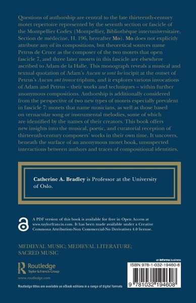 Questions of authorship are central to the late thirteenth-century motet repertoire represented by the seventh section or fascicle of the Montpellier Codex (Montpellier, Bibliothèque interuniversitaire, Section de médecine, H. 196, hereafter Mo). Mo does not explicitly attribute any of its compositions, but theoretical sources name Petrus de Cruce as the composer of the two motets that open fascicle 7, and three later motets in this fascicle are elsewhere ascribed to Adam de la Halle. This monograph reveals a musical and textual quotation of Adam's Aucun se sont loe incipit at the outset of Petrus's Aucun ont trouve triplum, and it explores various invocations of Adam and Petrus - their works and techniques - within further anonymous compositions. Authorship is additionally considered from the perspective of two new types of motets especially prevalent in fascicle 7: motets that name musicians, as well as those based on vernacular song or instrumental melodies, some of which are identified by the names of their creators. This book offers new insights into the musical, poetic, and curatorial reception of thirteenth-century composers' works in their own time. It uncovers, beneath the surface of an anonymous motet book, unsuspected interactions between authors and traces of compositional identities.