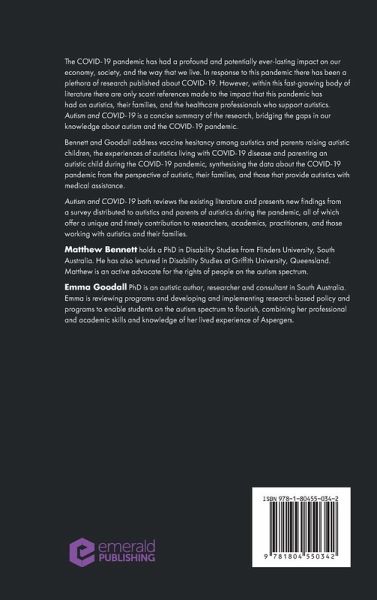 Autism and COVID-19 both reviews the existing literature and presents new findings from a survey distributed to autistics and parents of autistics during the pandemic, all of which offer a unique and timely contribution to researchers, academics, practitioners, and those working with autistics and their families.