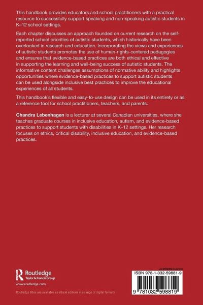 Each chapter discusses an approach founded on current research on the self-reported school priorities of autistic students, which historically have been overlooked in research and education. Incorporating the views and experiences of autistic students promotes the use of human-rights-centered pedagogies and ensures that evidence-based practices are both ethical and effective in supporting the learning and well-being success of autistic students. The informative content challenges assumptions of normative ability and highlights opportunities where evidence-based practices to support autistic students can be used alongside inclusive best practices to improve the educational experiences of all students.