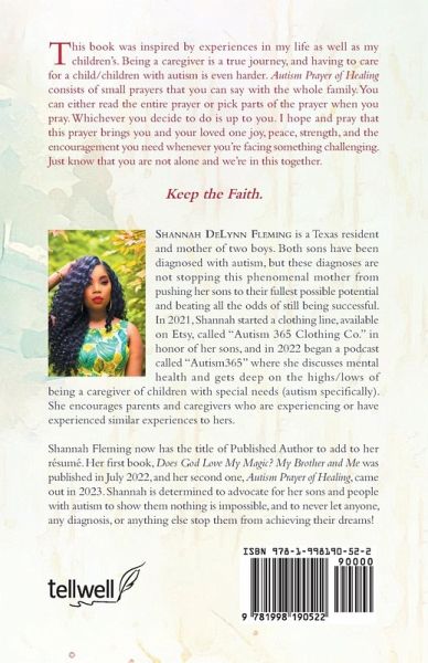 This book was inspired by experiences in my life as well as my children's. Being a caregiver is a true journey, and having to care for a child/children with autism is even harder. Autism Prayer of Healing consists of small prayers that you can say with the whole family. You can either read the entire prayer or pick parts of the prayer when you pray. Whichever you decide to do is up to you. I hope and pray that this prayer brings you and your loved one joy, peace, strength, and the encouragement you need whenever you're facing something challenging. Just know that you are not alone and we're in this together. Keep the Faith.