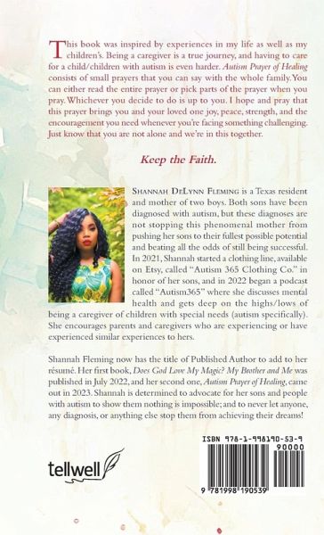 This book was inspired by experiences in my life as well as my children's. Being a caregiver is a true journey, and having to care for a child/children with autism is even harder. Autism Prayer of Healing consists of small prayers that you can say with the whole family. You can either read the entire prayer or pick parts of the prayer when you pray. Whichever you decide to do is up to you. I hope and pray that this prayer brings you and your loved one joy, peace, strength, and the encouragement you need whenever you're facing something challenging. Just know that you are not alone and we're in this together. Keep the Faith.