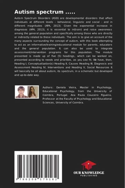 Autism Spectrum Disorders (ASD) are developmental disorders that affect individuals at different levels - behavioral, linguistic and social - and in different magnitudes (APA, 2013). Given the exponential increase in diagnoses (APA, 2013), it is essential to in(train) and raise awareness among the general population and specifically among those who are directly or indirectly related to these individuals. The aim is to give an account of the many aspects surrounding the concept of autism, with this book attempting to act as an informative/training/educational module for parents, educators and the general population. It can also be used to integrate assessment/intervention programs for this population. The module presented is made up of five (5) headings, which can be worked on, presented according to needs and priorities, as you see fit. We have, then, Heading I, Conceptualization(s) Heading II, Causes Heading III, Diagnosis and Assessment Heading IV, Interventions and Heading V, Social Resources It will basically be all about autism, its spectrum, in a schematic but developed and up-to-date way.