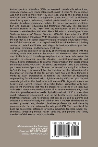 Autism Spectrum Disorders (ASD) has received considerable educational, research, medical and media attention the past ten years. Yet the condition was first described more than a hundred years ago. Due to the disorder being confused with childhood schizophrenia, there was a lack of definitive attention by special educators, medical professionals and mental health clinicians to advance parameters related to: causes; prevalence; identification and diagnosis; education and treatment. Positively, this confusion changed starting in the 1980s with the clarification of the differences between these disorders with the 1980 publication of the" Diagnostic and Statistical Manual of Mental Disorders" (DSM-III). Soon after, the 1990 federal legislation "Individuals with Disabilities Education Act" recognized the disorder as a disability category eligible for special education services. Both of these events lead to an explosion of information related to: finding causes; accurate identification and diagnosis; best educational practices; and social, emotional, and behavioral treatments. Even with this explosion in the body of knowledge concerned with this disorder, much more needs to be learned and discovered. The successful use of this body of knowledge requires that accurate information be provided to educators, parents, clinicians, medical professionals, and mental health professionals to counter misinformation that exists among the general public, educators and clinical professionals. This is the primary purpose of "Autism Spectrum Disorders: Inclusive Community for the 21st Century". It is accomplished by chapters on: the delineation of a blueprint for systems of care for persons with ASD and their families; a model to assist professionals in tackling the challenge of developing employability for individuals with high functioning ASD; best practice and research guidelines that lead to an affirmative ASD diagnosis; a comprehensive and current synopsis of genetic factors associated with ASD; adjustment challenges that may be present for a sibling of an individual with ASD; a comprehensive description of an innovative community-based clinic that provides services needed by Individuals with ASD to meet their social, behavioral, educational and mental health needs; and effective treatment strategies and techniques that can be utilized by parents and educators to work effectively with children who have ASD. The chapters are written by researchers, clinicians, business professionals, and university professors who have an extensive knowledge of ASD. The contents of the book are an excellent reference for special education teachers, school psychologists, practicing mental health clinicians, and parents and family members of children and adults with ASD.