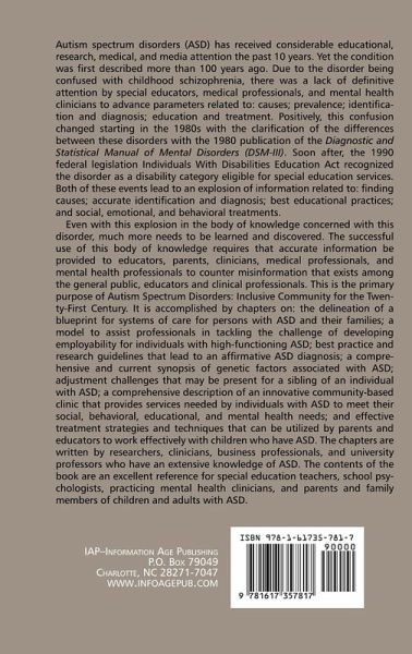 Autism Spectrum Disorders (ASD) has received considerable educational, research, medical and media attention the past ten years. Yet the condition was first described more than a hundred years ago. Due to the disorder being confused with childhood schizophrenia, there was a lack of definitive attention by special educators, medical professionals and mental health clinicians to advance parameters related to: causes; prevalence; identification and diagnosis; education and treatment. Positively, this confusion changed starting in the 1980s with the clarification of the differences between these disorders with the 1980 publication of the" Diagnostic and Statistical Manual of Mental Disorders" (DSM-III). Soon after, the 1990 federal legislation "Individuals with Disabilities Education Act" recognized the disorder as a disability category eligible for special education services. Both of these events lead to an explosion of information related to: finding causes; accurate identification and diagnosis; best educational practices; and social, emotional, and behavioral treatments. Even with this explosion in the body of knowledge concerned with this disorder, much more needs to be learned and discovered. The successful use of this body of knowledge requires that accurate information be provided to educators, parents, clinicians, medical professionals, and mental health professionals to counter misinformation that exists among the general public, educators and clinical professionals. This is the primary purpose of "Autism Spectrum Disorders: Inclusive Community for the 21st Century". It is accomplished by chapters on: the delineation of a blueprint for systems of care for persons with ASD and their families; a model to assist professionals in tackling the challenge of developing employability for individuals with high functioning ASD; best practice and research guidelines that lead to an affirmative ASD diagnosis; a comprehensive and current synopsis of genetic factors associated with ASD; adjustment challenges that may be present for a sibling of an individual with ASD; a comprehensive description of an innovative community-based clinic that provides services needed by Individuals with ASD to meet their social, behavioral, educational and mental health needs; and effective treatment strategies and techniques that can be utilized by parents and educators to work effectively with children who have ASD. The chapters are written by researchers, clinicians, business professionals, and university professors who have an extensive knowledge of ASD. The contents of the book are an excellent reference for special education teachers, school psychologists, practicing mental health clinicians, and parents and family members of children and adults with ASD.