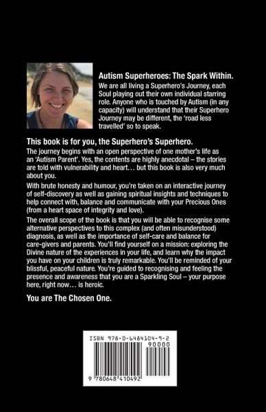 We are all living a Superhero’s Journey, each Soul playing out their own individual starring role. Anyone who is touched by Autism (in any capacity) will understand that their Superhero Journey may be different, the ‘road less travelled’ so to speak. This book is for you, the Superhero’s Superhero. The journey begins with an open perspective of one mother’s life as an ‘Autism Parent’. Yes, the contents are highly anecdotal – the stories are told with vulnerability and heart… but this book is also very much about you. With brute honesty and humour, you’re taken on an interactive journey of self-discovery as well as gaining spiritual insights and techniques to help connect with, balance and communicate with your Precious Ones (from a heart space of integrity and love). The overall scope of the book is that you will be able to recognise some alternative perspectives to this complex (and often misunderstood) diagnosis, as well as the importance of self-care and balance for care-givers and parents. You’ll ¿nd yourself on a mission: exploring the Divine nature of the experiences in your life and learn why the impact you have on your children is truly remarkable. You’ll be reminded of your blissful, peaceful nature. You’re guided to recognising and feeling the presence and awareness that you are a Sparkling Soul – your purpose here, right now… is heroic. You are The Chosen One.