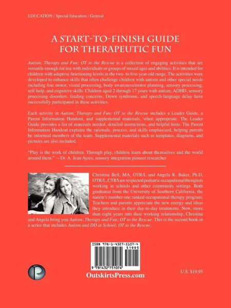 Autism, Therapy and Fun; OT to the Rescue is a collection of engaging activities that are versatile enough for use with individuals or groups of mixed ages and abilities. It is intended for children with adaptive functioning levels in the two- to five-year-old range. The activities were developed to enhance skills that often challenge children with autism and other special needs including fine motor, visual processing, body awareness/motor planning, sensory processing, self-help, and cognitive skills. Children aged 2 through 17 years with autism, ADHD, sensory processing disorders, feeding concerns, Down syndrome, and speech-language delay have successfully participated in these activities. Each activity in Autism, Therapy and Fun; OT to the Rescue includes a Leader Guide, Parent Information Handout, and supplemental materials, when appropriate. The Leader Guide provides a list of materials needed, detailed instructions, and helpful hints. The Parent Information Handout explains the rationale, process, and skills emphasized, helping parents be informed members of the team. Supplemental materials such as templates, diagrams, and pictures are also included. "It is a child's 'job' or 'occupation' to play in order to develop physical coordination, emotional maturity, social skills to interact with other children, and self-confidence to try new experiences and explore new environments" (www.aota.org, 10/4/2009). As pediatric occupational therapists (OT), we use this definition of occupation provided by the American Occupational Therapy Association to guide our practice. OTs infuse play with the opportunity to develop these skills, despite special needs or skill deficits. Children with autism often face overwhelming occupational challenges. "Autism is a developmental disability that affects how the brain functions, and often impairs social skills development and communication. Occupational therapy practitioners work collaboratively with the school team to help students with autism to access, progress, and participate in the curriculum. They help students to achieve success in academic performance and social participation throughout the school day." (www.aota.org, 10/4/2009) Christina Bell, MA, OTR/L and Angela R. Baker, Ph.D, OTR/L, CTRS are respected pediatric occupational therapists working in schools and other community settings. Both graduated from the University of Southern California, the nation's number one ranked occupational therapy program. Teachers and parents appreciate the new energy and ideas they introduce in their day-to-day treatments. Now, more than eight years into their working relationship, Christina and Angela bring you Autism, Therapy and Fun; OT to the Rescue. This is the second book in a series that includes Autism and DD at School; OT to the Rescue.