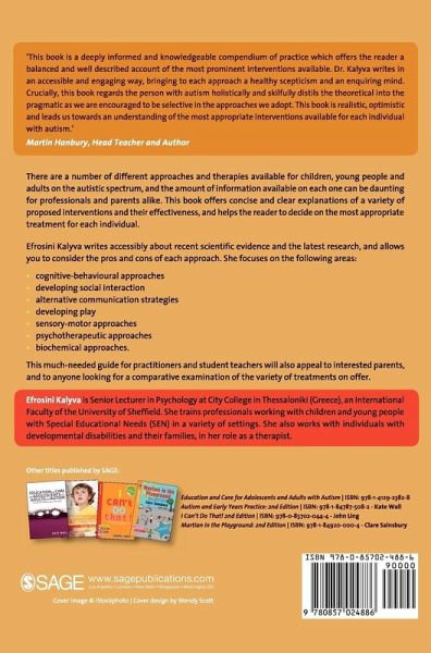 'This book is a deeply informed and knowledgeable compendium of practice which offers the reader a balanced and well described account of the most prominent interventions available. Dr. Kalyva writes in an accessible and engaging way bringing to each approach a healthy scepticism and an enquiring mind. Crucially, this book regards the person with autism holistically and skilfully distils the theoretical into the pragmatic as we are encouraged to be selective in the approaches we adopt. This book is realistic, optimistic and leads us towards an understanding of the most appropriate interventions available for each individual with autism' -