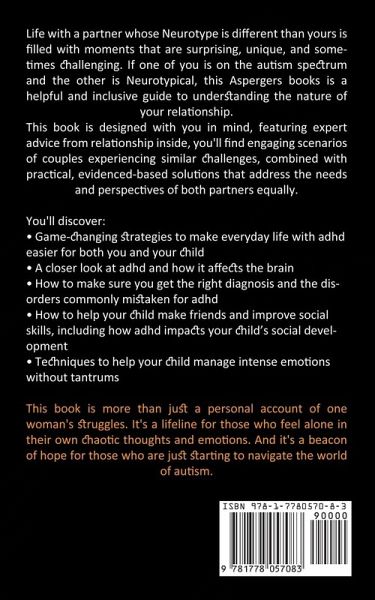 Life with a partner whose Neurotype is different than yours is filled with moments that are surprising, unique, and sometimes challenging. If one of you is on the autism spectrum and the other is Neurotypical, this Aspergers books is a helpful and inclusive guide to understanding the nature of your relationship. This book is designed with you in mind, featuring expert advice from relationship inside, you'll find engaging scenarios of couples experiencing similar challenges, combined with practical, evidenced-based solutions that address the needs and perspectives of both partners equally. You'll discover:Game-changing strategies to make everyday life with adhd easier for both you and your child A closer look at adhd and how it affects the brain How to make sure you get the right diagnosis and the disorders commonly mistaken for adhd How to help your child make friends and improve social skills, including how adhd impacts your child's social development Techniques to help your child manage intense emotions without tantrums This book is more than just a personal account of one woman's struggles. It's a lifeline for those who feel alone in their own chaotic thoughts and emotions. And it's a beacon of hope for those who are just starting to navigate the world of autism.