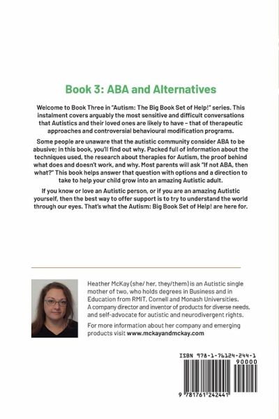 Autism: The Big Book Set of Help!: Book Three: ABA and the Alternatives Welcome to Book Three in "Autism: The Big Book Set of Help!" series. This instalment covers arguably the most sensitive and difficult conversations that Autistics and their loved ones are likely to have - that of therapeutic approaches and controversial behavioural modification programs. Some people are unaware that the autistic community consider ABA to be abusive; in this book, you'll find out why. Packed full of information about the techniques used, the research about therapies for Autism, the proof behind what does and doesn't work, and why. Most parents will ask "If not ABA, then what?" This book helps answer that question with options and a direction to take to help your child grow into an amazing Autistic adult. If you know or love an Autistic person, or if you are an amazing Autistic yourself, then the best way to offer support is to try to understand the world through our eyes. That's what the "Autism: Big Book Set of Help!" is here for. Providing understanding shared from inside a neurodivergent brain. Heather McKay (she/ her, they/them) is an Autistic single mother of two, who holds degrees in Business and Education from RMIT, Cornell, and Monash Universities. A company director and inventor of products for diverse needs, and a self-advocate for autistic and neurodivergent rights. For more information about her company and emerging products visit www.mckayandmckay.com
