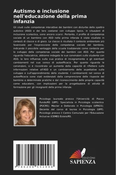 Gli studi sulle competenze interattive dei bambini con disturbo dello spettro autistico (ASD) e dei loro coetanei con sviluppo tipico, in situazioni di inclusione scolastica, sono ancora scarsi. Pertanto, il profilo di competenza sociale di un bambino con ASD nella prima infanzia è stato studiato in contesti di classe e di gioco. La classe è risultata il contesto ambientale più favorevole per l'espressione della competenza sociale del bambino, indicando il possibile vantaggio della scuola tradizionale come contesto per lo sviluppo della competenza sociale dei bambini con ASD. Per quanto riguarda l'educatrice, abbiamo indagato le sue convinzioni sullo studente con ASD, la loro influenza sulla sua pratica di insegnamento e gli eventuali cambiamenti nel suo senso di autoefficacia. Per quanto riguarda le convinzioni, si è riscontrato un aumento della capacità di riflettere sulle informazioni relative all'ASD e un cambiamento delle aspettative sullo sviluppo e sull'apprendimento dello studente. I cambiamenti nel senso di autoefficacia sono stati evidenziati dalla comprensione delle risposte del bambino a determinate pratiche e dal riconoscimento delle proprie capacità come educatore, con implicazioni per la progettazione di attività di formazione per gli insegnanti della prima infanzia.