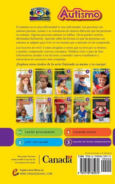 El autismo no es una enfermedad ni una enfermedad. Las personas con autismo piensan, actúan y se comunican de manera diferente que las personas no autistas. Algunas personas autistas no hablan. Otros pueden sentirse abrumados fácilmente. Aprende sobre las formas en que las personas con autismo se adaptan para vivir en un mundo que a menudo no las comprende. Los lectores de nivel 3 están dirigidos a niños que ya leen por sí mismos y pueden comprender nuevos conceptos. Palabras clave y pies de foto informativos ayudan a los lectores a entender nuevo vocabulario y estructuras de oraciones más complejas. Este proyecto ha sido posible en parte gracias al Gobierno de Canadá.