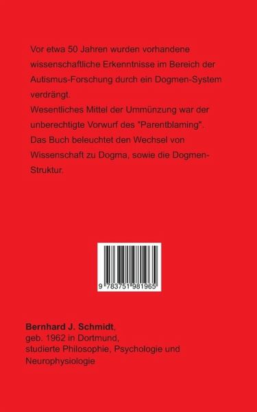 Vor etwa 50 Jahren wurden vorhandene wissenschaftliche Erkenntnisse im Bereich der Autismus-Forschung durch ein Dogmen-System verdrängt. Wesentliches Mittel der Ummünzung war der unberechtigte Vorwurf des "Parentblaming".Das Buch beleuchtet den Wechsel von Wissenschaft zu Dogma, sowie die Dogmen-Struktur.www.b-j-schmidt.info