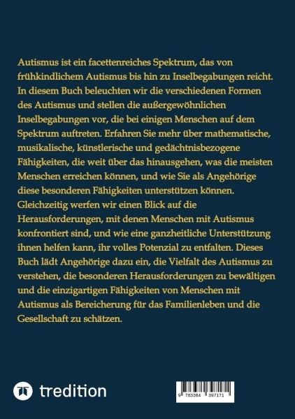 Autismus ist ein facettenreiches Spektrum, das von frühkindlichem Autismus bis hin zu Inselbegabungen reicht. In diesem Buch beleuchten wir die verschiedenen Formen des Autismus und stellen die außergewöhnlichen Inselbegabungen vor, die bei einigen Menschen auf dem Spektrum auftreten. Erfahren Sie mehr über mathematische, musikalische, künstlerische und gedächtnisbezogene Fähigkeiten, die weit über das hinausgehen, was die meisten Menschen erreichen können, und wie Sie als Angehörige diese besonderen Fähigkeiten unterstützen können. Gleichzeitig werfen wir einen Blick auf die Herausforderungen, mit denen Menschen mit Autismus konfrontiert sind, und wie eine ganzheitliche Unterstützung ihnen helfen kann, ihr volles Potenzial zu entfalten. Dieses Buch lädt Angehörige dazu ein, die Vielfalt des Autismus zu verstehen, die besonderen Herausforderungen zu bewältigen und die einzigartigen Fähigkeiten von Menschen mit Autismus als Bereicherung für das Familienleben und die Gesellschaft zu schätzen.