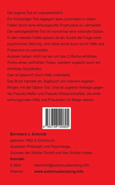 Der eigene Tod ist unausweichlich.Ein frühzeitiger Tod dagegen wäre zumindest in vielen Fällen durch eine wirkungsvolle Prophylaxe zu vermeiden.Der selbstgewählte Tod ist manchmal eine rationale Option. In den meisten Fällen jedoch ist ein Suizid die Folge einer psychischen Störung. Und wäre somit auch durch Hilfe und Prävention zu vermeiden.Autisten haben nicht nur ein um das 2,5fache erhöhtes Risiko eines verfrühten Todes, sondern zugleich auch ein erhöhtes Suizidrisiko. Das ist bekannt! Doch Hilfe unterbleibt.Das Buch handelt als Tagebuch von meinem eigenen Ringen mit der Option Tod. Und ist zugleich Anklage gegen die Pseudo-Helfer und Pseudo-Wissenschaftler, die einer wirkungsvollen Hilfe und Prävention im Wege stehen.