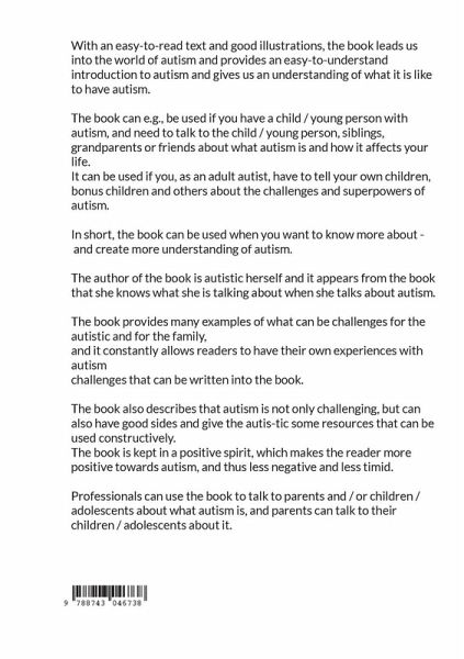 With an easy-to-read text and good illustrations, the book leads us into the world of autism and provides an easy-to-understand introduction to autism and gives us an understanding of what it is like to have autism.The book can e.g., be used if you have a child / young person with autism, and need to talk to the child / young person, siblings, grandparents or friends about what autism is and how it affects your life.It can be used if you, as an adult autist, have to tell your own children, bonus children and others about the challenges and superpowers of autism.In short, the book can be used when you want to know more about - and create more understanding of autism.The author of the book is autistic herself and it appears from the book that she knows what she is talking about when she talks about autism.The book provides many examples of what can be challenges for the autistic and for the family,and it constantly allows readers to have their own experiences with autismchallenges that can be written into the book.The book also describes that autism is not only challenging, but can also have good sides and give the autis-tic some resources that can be used constructively.The book is kept in a positive spirit, which makes the reader more positive towards autism, and thus less negative and less timid.Professionals can use the book to talk to parents and / or children / adolescents about what autism is, and parents can talk to their children / adolescents about it.