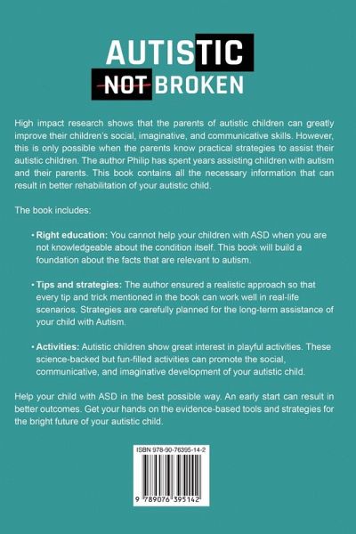 High impact research shows that the parents of autistic children can greatly improve their children's social, imaginative, and communicative skills. However, this is only possible when parents know practical strategies to assist their autistic children. The author Philip has spent years assisting children with autism and their parents. This book contains all the necessary information that can result in better rehabilitation of your autistic child. The book includes: Right education: You cannot help your children with ASD when you are not knowledgeable about the condition itself. This book will build a foundation about the facts that are relevant to autism. Tips and strategies: The author ensured a realistic approach so that every tip and trick mentioned in the book can work well in real-life scenarios. Strategies are carefully planned for the long-term assistance of your child with autism. Activities: Autistic children show great interest in playful activities. These science-backed but fun-filled activities can promote the social, communicative, and imaginative development of your autistic child. Help your child with ASD in the best possible way. An early start can result in better outcomes. Get your hands on the evidence-based tools and strategies for the bright future of your autistic child.