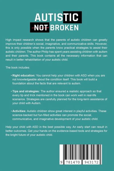 High impact research shows that the parents of autistic children can greatly improve their children's social, imaginative, and communicative skills. However, this is only possible when parents know practical strategies to assist their autistic children. The author Philip has spent years assisting children with autism and their parents. This book contains all the necessary information that can result in better rehabilitation of your autistic child. The book includes: Right education: You cannot help your children with ASD when you are not knowledgeable about the condition itself. This book will build a foundation about the facts that are relevant to autism. Tips and strategies: The author ensured a realistic approach so that every tip and trick mentioned in the book can work well in real-life scenarios. Strategies are carefully planned for the long-term assistance of your child with Autism. Activities: Autistic children show great interest in playful activities. These science-backed but fun-filled activities can promote the social, communicative, and imaginative development of your autistic child. Help your child with ASD in the best possible way. An early start can result in better outcomes. Get your hands on the evidence-based tools and strategies for the bright future of your autistic child.