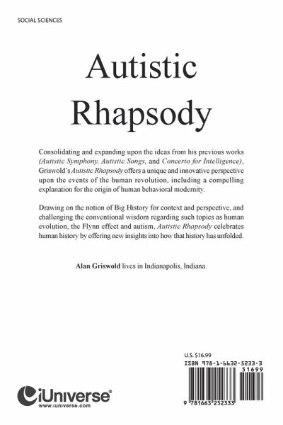 Consolidating and expanding upon the ideas from his previous works (Autistic Symphony, Autistic Songs, and Concerto for Intelligence), Griswold's Autistic Rhapsody offers a unique and innovative perspective upon the events of the human revolution, including a compelling explanation for the origin of human behavioral modernity. Drawing on the notion of Big History for context and perspective, and challenging the conventional wisdom regarding such topics as human evolution, the Flynn effect and autism, Autistic Rhapsody celebrates human history by offering new insights into how that history has unfolded.