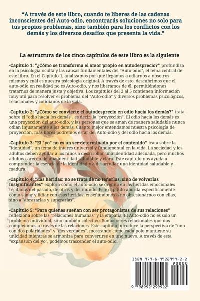 "A través de este libro, cuando te liberes de las cadenas inconscientes del Auto-odio, encontrarás soluciones no solo para tus propios problemas, sino también para los conflictos con los demás y los diversos desafíos que presenta la vida." Este libro incluye el tema del Auto-odio, cómo curarse de diversos traumas, cómo evitar que te hagan daño en la vida cotidiana, reflexiones sobre las relaciones y la madurez psicológica. - Superar el auto-odio, que es un amor propio distorsionado, y recuperar la autoafirmación. - Detener el odio equivocado hacia los demás, que es una proyección externa del auto-odio. - Determinar mi propia identidad, no por los demás ni la sociedad. - Hacer insignificantes las heridas del pasado, sin 'reprimirlas, distorsionarlas o evitarlas'. - Convertirse en el dueño de las relaciones, no en su esclavo. 1. El auto-odio es una psicología que todas las personas tienen en cierto grado. Se manifiesta desde la autocrítica y la reflexión hasta formas severas de autodegradación, autodesprecio y culpa. 2. En la raíz del Auto-odio, en realidad se ocultan el amor propio y el sentimiento de superioridad. Es el resultado distorsionado del intento de convertirse en una mejor versión de uno mismo. 3. A menudo nos identificamos con una autoimagen negativa y tratamos de mantenerla. Esta es una aplicación errónea del instinto de autoprotección. 4. Para superar el auto-odio, no basta con reprimirlo o ignorarlo, sino que debemos entender su mecanismo y hacerlo consciente. 5. No debemos ver al 'yo' como un ser determinado por contenidos o condiciones. En cambio, debemos reconocer su valor incondicional. 6. El odio y la proyección hacia los demás también pueden ser expresiones del Auto-odio. Es importante reconocerlo y superarlo. 7. Para relaciones saludables, debemos buscar el amor horizontal en lugar de la dependencia vertical. 8. Al superar el auto-odio y practicar el verdadero amor propio, podemos vivir una vida más feliz y abundante. -Capítulo 1: "¿Cómo se transforma el amor propio en autodesprecio?" explora la psicología oculta del auto-odio, tema central del libro. Descubrirás por qué nos odiamos y cómo liberarnos de este sentimiento, aprendiendo a tratarnos de manera justa. -Capítulo 2: "¿Cómo se convierte el autodesprecio en odio hacia los demás?" analiza cómo el auto-odio se proyecta hacia otros. Las personas que se aman sanamente no odian a los demás. Comprender nuestra proyección nos libera. -Capítulo 3: "El "yo" no es un ser determinado por el contenido" aborda la identidad, tema fundamental en la vida. Mientras la sociedad debe ayudar a desarrollar identidades saludables, muchos adultos carecen de ella. -Capítulo 4: "Las heridas: no se trata de no tenerlas, sino de volverlas insignificantes" trata sobre las heridas emocionales del pasado que causan auto-odio. Aprenderás a sanarlas abrazándolas para superarlas. -Capítulo 5: "Para quienes sueñan con ser protagonistas de sus relaciones" explora las relaciones y la empatía. El auto-odio es tanto individual como colectivo. Somos seres relacionales que nos completamos con otros. Introduce el concepto de "dos polaridades" y "dos verdades".
