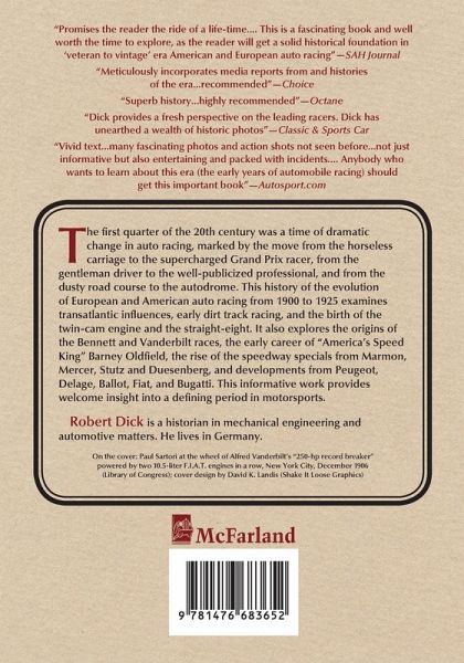 The first quarter of the 20th century was a time of dramatic change in auto racing, marked by the move from the horseless carriage to the supercharged Grand Prix racer, from the gentleman driver to the well-publicized professional, and from the dusty road course to the autodrome. This history of the evolution of European and American auto racing from 1900 to 1925 examines transatlantic influences, early dirt track racing, and the birth of the twin-cam engine and the straight-eight. It also explores the origins of the Bennett and Vanderbilt races, the early career of "America's Speed King" Barney Oldfield, the rise of the speedway specials from Marmon, Mercer, Stutz and Duesenberg, and developments from Peugeot, Delage, Ballot, Fiat, and Bugatti. This informative work provides welcome insight into a defining period in motorsports.