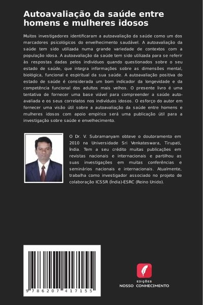 Muitos investigadores identificaram a autoavaliação da saúde como um dos marcadores psicológicos do envelhecimento saudável. A autoavaliação da saúde tem sido utilizada numa grande variedade de contextos com a população idosa. A autoavaliação da saúde tem sido utilizada para se referir às respostas dadas pelos indivíduos quando questionados sobre o seu estado de saúde, que integra informações sobre as dimensões mental, biológica, funcional e espiritual da sua saúde. A autoavaliação positiva do estado de saúde é considerada um bom indicador da longevidade e da competência funcional dos adultos mais velhos. O presente livro é uma tentativa de fornecer uma base viável para compreender a saúde auto-avaliada e os seus correlatos nos indivíduos idosos. O esforço do autor em fornecer uma visão útil sobre a autoavaliação da saúde entre homens e mulheres idosos com apoio empírico será uma publicação útil para a investigação sobre saúde e envelhecimento.