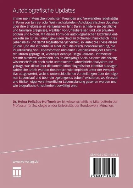 Immer mehr Menschen berichten Freunden und Verwandten regelmäßig in Form von Jahres- oder Weihnachtsbriefen (Autobiografischen Updates) über ihre Erlebnisse im vergangenen Jahr. Darin schildern sie berufliche und familiäre Ereignisse, erzählen von Urlaubsreisen und von privaten Sorgen und Nöten. Mit dieser Form der autobiografischen Erzählung entwickeln sie für sich einen gewissen Grad an Sicherheit hinsichtlich ihres Lebenslaufs und damit biografische Sicherheit, so lautet die These dieser Studie. Und das ist heute, in einer Zeit, die durch Individualisierung, die Pluralisierung von Lebensformen und einer Flexibilisierung der Erwerbsstrukturen geprägt ist, wichtiger denn je. Helga Pelizäus-Hoffmeister hat mit Masterstudierenden des Studiengangs Social Science die bislang wissenschaftlich noch nicht untersuchten Jahresbriefe analysiert und gefragt, was diese über die Konstruktion biografischer Identität aussagen. Zahlreiche Briefe wurden theoretisch wie empirisch unter der Perspektive ausgewertet, welche unterschiedlichen Vorstellungen über den eigenen Lebenslauf und über ein "gelungenes Leben" existieren, wo Grenzen und Risiken eigenverantwortlicher Lebensplanung gesehen werden und wie biografische Unsicherheit bewältigt wird.