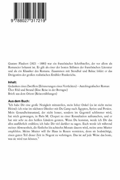 Gustave Flaubert (1821 - 1880) war ein französischer Schriftsteller, der vor allem als Romancier bekannt ist. Er gilt als einer der besten Stilisten der französischen Literatur und als ein Klassiker des Romans. Zusammen mit Stendhal und Balzac bildet er das Dreigestirn der großen realistischen Erzähler Frankreichs. Inhalt: - Gedanken eines Zweiflers (Erinnerungen eines Verrückten) - Autobiografischer Roman - Über Feld und Strand (Eine Reise in der Bretagne) - Briefe aus dem Orient (Reiseerzählungen) - Aus dem Buch: - "Ich habe Dir eine große Neuigkeit mitzuteilen, mein lieber Onkel (es ist nicht meine Heirat): ich reise im nächsten Oktober mit Du Camp nach Ägypten, Syrien und Persien. Mein Gesundheitszustand, der nicht besser, sondern im Gegenteil schlimmer wird, hat mich gezwungen, in Paris M. Cloquet zu einer Konsultation aufzusuchen, und er hat mir sehr zu den heißen Ländern geraten. Wenn Du kommst, werde ich Dir das alles ausführlich erzählen; ich habe Dir viel darüber zu sagen. Euch werde ich während meiner Abwesenheit, die fünfzehn bis achtzehn Monate dauern wird, meine arme Mutter empfehlen. Meine Mutter will ihr Haus in Rouen vermieten, denn sie beabsichtigt, einen guten Teil dieser Zeit in Nogent zu verbringen. Das ist auf jede Weise das beste, was sie wird tun können."