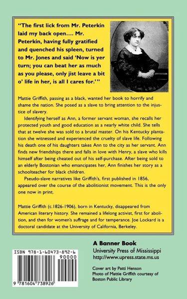 Autobiography of a Female Slave by Mattie Griffith with an afterword by Joe Lockard Mattie Griffith, passing as a black, wanted her book to horrify and shame the nation. She posed as a slave to bring attention to the injustice of slavery. Identifying herself as Ann, a former servant woman, she recalls her protected youth and good education as a nearly white child. She tells that at twelve she was sold to a brutal master. On his Kentucky plantation she witnessed and experienced the cruelty of slave life. Following his death one of his daughters takes Ann to the city as her servant. Ann finds new friendships there and falls in love with Henry, a slave who kills himself after being cheated out of his self-purchase. After being sold to an elderly Bostonian who emancipates her, Ann finishes her story as a schoolteacher for black children. Pseudo-slave narratives like Griffith's, first published in 1856, appeared over the course of the abolitionist movement. This is the only one now in print. Mattie Griffith (c.1826-1906), born in Kentucky, disappeared from American literary history. She remained a lifelong activist, first for abolition, and then for women's suffrage and for temperance. Joe Lockard is a doctoral candidate at the University of California, Berkeley.