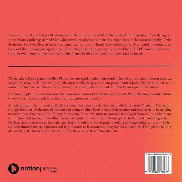 Have you heard a polybag talk about his birth and journey in life? The book, Autobiography of a Polybag is a story about a polybag named Orb who travels to places and pens his experiences in his autobiography. Orb's desire for his own 3R's to Save the Planet are an ode to Earth Day celebrations. The world manufactures, uses and then campaigns against use of poly bags calling them environmental hazard. Orb's story, as you read through will bring to light his love for the Planet Earth and his desire to love and be loved.
