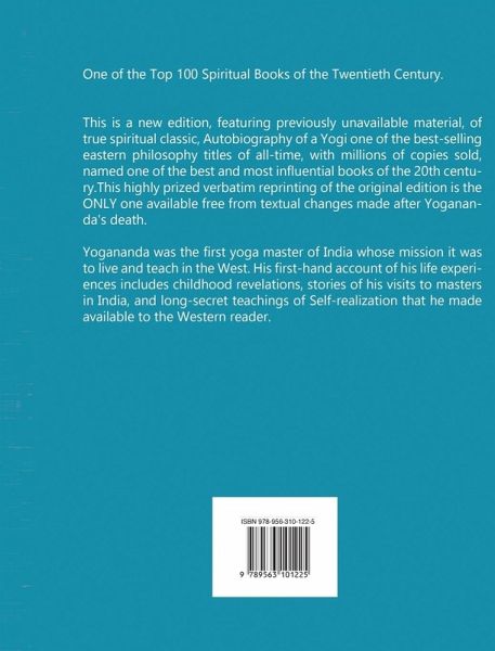 One of the Top 100 Spiritual Books of the Twentieth Century. New Bonus Materials added to this edition include: the last chapter that Yogananda wrote covering the years 1946-1951 that was not available in the original edition, the eulogy that Yogananda wrote for Gandhi, a new afterword by Swami Kriyananda, one of Yogananda's closest disciples.This is a new edition, featuring previously unavailable material, of true spiritual classic, Autobiography of a Yogi one of the best-selling eastern philosophy titles of all-time, with millions of copies sold, named one of the best and most influential books of the 20th century.This highly prized verbatim reprinting of the original 1946 edition is the ONLY one available free from textual changes made after Yogananda's death.This updated edition contains bonus materials, including a last chapter that Yogananda himself wrote in 1951, five years after the publication of the first edition. It is the only version of this chapter available without posthumous changes.Yogananda was the first yoga master of India whose mission it was to live and teach in the West. His first-hand account of his life experiences includes childhood revelations, stories of his visits to saints and masters in India, and long-secret teachings of Self-realization that he made available to the Western reader.