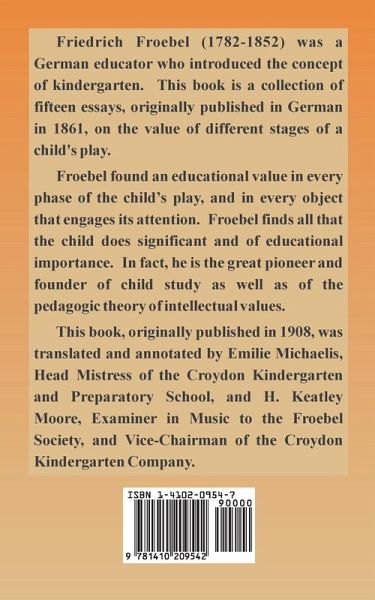 Friedrich Froebel (1782-1852) was a German educator who introduced the concept of kindergarten. This book is a collection of fifteen essays, originally published in German in 1861, on the value of different stages of a child's play. Froebel found an educational value in every phase of the child's play, and in every object that engages its attention. Froebel finds all that the child does significant and of educational importance. In fact, he is the great pioneer and founder of child study as well as of the pedagogic theory of intellectual values. This book, originally published in 1908, was translated and annotated by Emilie Michaelis, Head Mistress of the Croydon Kindergarten and Preparatory School, and H. Keatley Moore, Examiner in Music to the Froebel Society, and Vice-Chairman of the Croydon Kindergarten Company.