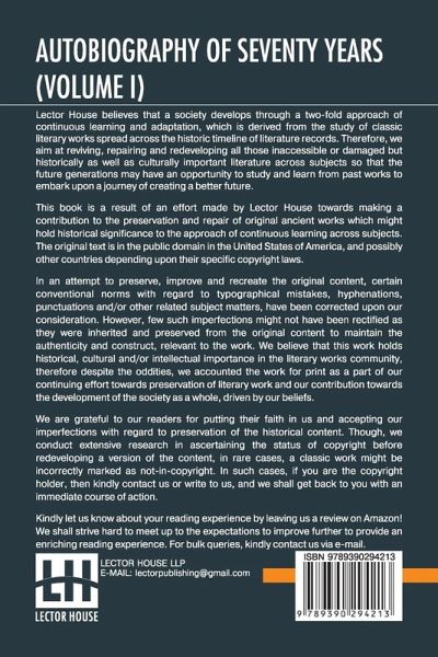 Autobiography Of Seventy Years (Volume I): In Two Volumes, Vol. I. This book is a result of an effort made by us towards making a contribution to the preservation and repair of original classic literature. In an attempt to preserve, improve and recreate the original content, we have worked towards: 1. Type-setting & Reformatting: The complete work has been re-designed via professional layout, formatting and type-setting tools to re-create the same edition with rich typography, graphics, high quality images, and table elements, giving our readers the feel of holding a 'fresh and newly' reprinted and/or revised edition, as opposed to other scanned & printed (Optical Character Recognition - OCR) reproductions. 2. Correction of imperfections: As the work was re-created from the scratch, therefore, it was vetted to rectify certain conventional norms with regard to typographical mistakes, hyphenations, punctuations, blurred images, missing content/pages, and/or other related subject matters, upon our consideration. Every attempt was made to rectify the imperfections related to omitted constructs in the original edition via other references. However, a few of such imperfections which could not be rectified due to intentional\unintentional omission of content in the original edition, were inherited and preserved from the original work to maintain the authenticity and construct, relevant to the work. We believe that this work holds historical, cultural and/or intellectual importance in the literary works community, therefore despite the oddities, we accounted the work for print as a part of our continuing effort towards preservation of literary work and our contribution towards the development of the society as a whole, driven by our beliefs. We are grateful to our readers for putting their faith in us and accepting our imperfections with regard to preservation of the historical content. HAPPY READING!