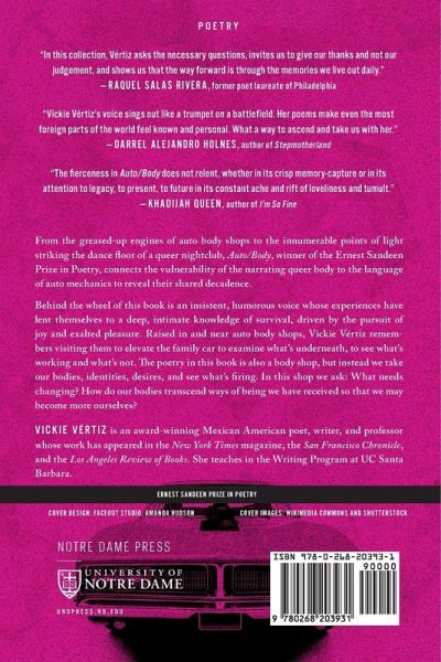 The poems in Auto/Body are an inexhaustible engine-sometimes a body, sometimes flesh-a sensual exploration of what it means to repair, to remake, to keep going even when rebuilding feels impossible. From the greased-up engines of auto body shops to the innumerable points of light striking the dance floor of a queer nightclub, Auto/Body, winner of the Ernest Sandeen Prize in Poetry, connects the vulnerability of the narrating queer body to the language of auto mechanics to reveal their shared decadence. Behind the wheel of this book is an insistent, humorous voice whose experiences have lent themselves to a deep, intimate knowledge of survival, driven by the pursuit of joy and exalted pleasure. Raised in and near auto body shops, Vickie Vértiz remembers visiting them to elevate the family car to examine what's underneath, to see what's working and what's not. The poetry in this book is also a body shop, but instead we take our bodies, identities, desires, and see what's firing. In this shop we ask: What needs changing? How do our bodies transcend ways of being we have received so that we may become more ourselves? From odes to drag, to pushing back on the tyranny of patriarchy, to loving too hard and too queer, to growing up working-class in a time of incessant border violence and incarceration, this collection combusts with blood and fuel. In other words, Vértiz writes to dissolve a colonial engine and reconstruct a new vessel with its remains.