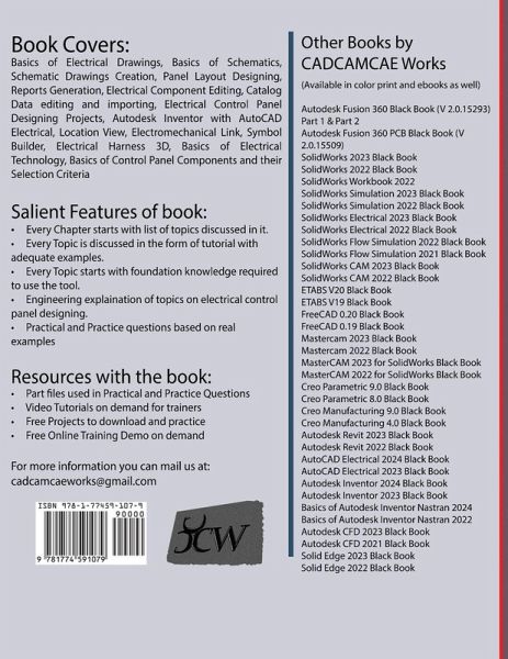 The AutoCAD Electrical 2024 Black Book, the 9th edition of AutoCAD Electrical Black book, has been updated as per the enhancements in the AutoCAD Electrical 2024. Following the same strategy as for the previous edition, the book follows a step-by-step methodology. It covers almost all the information required by a learner to master the AutoCAD Electrical. The book starts with basics of Electrical Designing, goes through all the Electrical controls related tools and discusses practical examples of electrical schematic and panel designing. Chapter on Reports makes you able to create and edit electrical component reports. We have also discussed the interoperability between Autodesk Inventor and AutoCAD Electrical which is need of industry these days. Two annexures have been added to explain basic concepts of control panel designing. Some of the salient features of this book are: In-Depth explanation of concepts Every new topic of this book starts with the explanation of the basic concepts. In this way, the user becomes capable of relating the things with real world. Topics Covered Every chapter starts with a list of topics being covered in that chapter. In this way, the user can easily find the topic of his/her interest easily. Instruction through illustration The instructions to perform any action are provided by maximum number of illustrations so that the user can perform the actions discussed in the book easily and effectively. There are about 900 small and large illustrations that make the learning process effective. Tutorial point of view At the end of concept's explanation, the tutorial makes the understanding of users' firm and long lasting. Almost each chapter of the book has tutorials that are real world projects. Moreover, most of the tools in this book are discussed in the form of tutorials. For Faculty If you are a faculty member then you can ask for video tutorials on any of the topic, exercise, tutorial, or concept. As faculty, you can register on our website to get electronic desk copies of our latest books, self-assessment, and solution of practical. Faculty resources are available in the Faculty Member page of our website once you login. Note that faculty registration approval is manual and it may take two days for approval before you can access the faculty website.