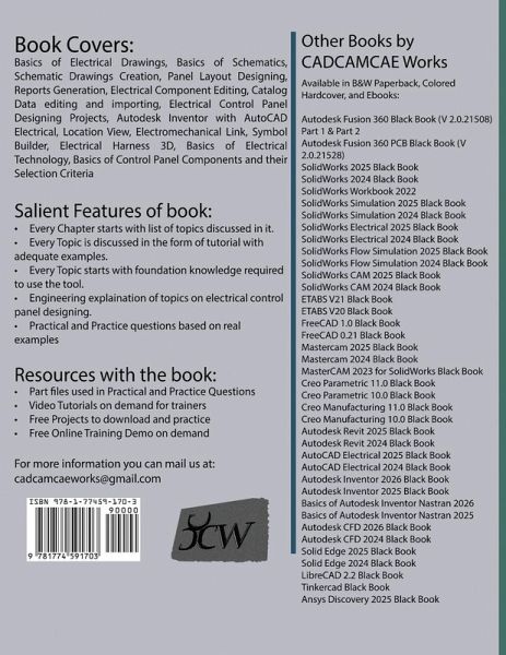 AutoCAD Electrical 2026 Black Book - 11th Edition Complete Guide to AutoCAD Electrical 2026 Step-by-Step Learning The AutoCAD Electrical 2026 Black Book, 11th edition, is your complete and updated resource for learning AutoCAD Electrical 2026. Designed with a step-by-step approach, this book aligns with the latest enhancements in the software and is ideal for students, professionals, and instructors. This AutoCAD Electrical 2026 tutorial book starts with the basics of electrical designing and gradually explores advanced tools related to schematic design, panel layout, PLC modules, and more. Real-world projects, practical tutorials, and over 550 multiple choice questions (MCQs) help reinforce learning and track progress. Key Features ¿¿¿¿ Beginner-Friendly to Advanced Covers everything from basic electrical design to control panel designing and report generation. ¿¿¿¿ Concept-Based Learning Each topic begins with clear conceptual explanations to build strong foundations and connect theory to real-world applications. ¿¿¿¿ Topic Navigation Every chapter opens with a list of topics, making it easy to find specific AutoCAD Electrical tools or features. ¿¿¿¿ 920+ Illustrations Packed with over 920 diagrams and screenshots, offering detailed visual guidance for better understanding. ¿¿¿¿ Hands-On Tutorials & Projects Most chapters end with real-world tutorials that help reinforce learning. Tools are taught in context through exercises that simulate industry projects. ¿¿¿¿ MCQs for Self-Evaluation Includes 550+ MCQs to test your understanding and assist in exam preparation. ¿¿¿¿ Control Panel Design Explained Two detailed annexures cover the fundamentals of control panel layout design, ideal for those focusing on automation and manufacturing systems. ¿¿¿¿ AutoCAD Electrical + Autodesk Inventor Learn how to integrate AutoCAD Electrical 2026 with Autodesk Inventor, a crucial skill in modern engineering workflows. For Faculty & Instructors Faculty members can register at www.cadcamcaeworks.com to access:Course Outline and Part Files Instructor desk copies Self-assessment solutions Faculty registration is manually approved within 2 business days. Why Choose This Book?Best book for AutoCAD Electrical 2026 learners Perfect for students, electrical engineers, and CAD professionals Follows a step-by-step AutoCAD Electrical training approach Real projects included for hands-on experience Updated for the latest AutoCAD Electrical 2026 tools and interface