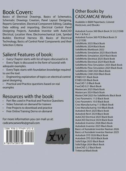 AutoCAD Electrical 2026 Black Book - 11th Edition Complete Guide to AutoCAD Electrical 2026 Step-by-Step Learning The AutoCAD Electrical 2026 Black Book, 11th edition, is your complete and updated resource for learning AutoCAD Electrical 2026. Designed with a step-by-step approach, this book aligns with the latest enhancements in the software and is ideal for students, professionals, and instructors. This AutoCAD Electrical 2026 tutorial book starts with the basics of electrical designing and gradually explores advanced tools related to schematic design, panel layout, PLC modules, and more. Real-world projects, practical tutorials, and over 550 multiple choice questions (MCQs) help reinforce learning and track progress. Key Features ¿¿¿¿ Beginner-Friendly to Advanced Covers everything from basic electrical design to control panel designing and report generation. ¿¿¿¿ Concept-Based Learning Each topic begins with clear conceptual explanations to build strong foundations and connect theory to real-world applications. ¿¿¿¿ Topic Navigation Every chapter opens with a list of topics, making it easy to find specific AutoCAD Electrical tools or features. ¿¿¿¿ 920+ Illustrations Packed with over 920 diagrams and screenshots, offering detailed visual guidance for better understanding. ¿¿¿¿ Hands-On Tutorials & Projects Most chapters end with real-world tutorials that help reinforce learning. Tools are taught in context through exercises that simulate industry projects. ¿¿¿¿ MCQs for Self-Evaluation Includes 550+ MCQs to test your understanding and assist in exam preparation. ¿¿¿¿ Control Panel Design Explained Two detailed annexures cover the fundamentals of control panel layout design, ideal for those focusing on automation and manufacturing systems. ¿¿¿¿ AutoCAD Electrical + Autodesk Inventor Learn how to integrate AutoCAD Electrical 2026 with Autodesk Inventor, a crucial skill in modern engineering workflows. For Faculty & Instructors Faculty members can register at www.cadcamcaeworks.com to access:Course Outline and Part Files Instructor desk copies Self-assessment solutions Faculty registration is manually approved within 2 business days. Why Choose This Book?Best book for AutoCAD Electrical 2026 learners Perfect for students, electrical engineers, and CAD professionals Follows a step-by-step AutoCAD Electrical training approach Real projects included for hands-on experience Updated for the latest AutoCAD Electrical 2026 tools and interface