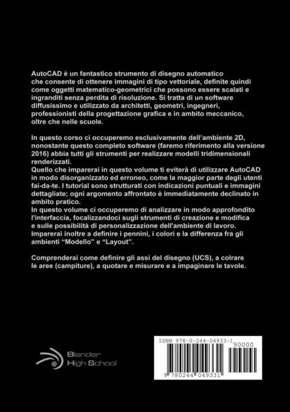 AutoCAD è un fantastico strumento di disegno automatico che consente di ottenere immagini di tipo vettoriale, definite quindi come oggetti matematico-geometrici che possono essere scalati e ingranditi senza perdita di risoluzione. Si tratta di un software diffusissimo e utilizzato da architetti, geometri, ingegneri, professionisti della progettazione grafica e in ambito meccanico, oltre che nelle scuole. In questo corso ci occuperemo esclusivamente dell'ambiente 2D, nonostante questo completo software (faremo riferimento alla versione 2016) abbia tutti gli strumenti per realizzare modelli tridimensionali renderizzati. Quello che imparerai in questo libro ti eviterà di utilizzare AutoCAD in modo disorganizzato ed erroneo, come la maggior parte degli utenti fai-da-te. I tutorial sono strutturati con indicazioni puntuali e immagini dettagliate; ogni argomento affrontato è immediatamente declinato in ambito pratico.
