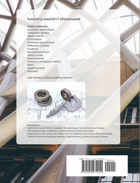 Mainio itseopiskeluopas, joka pohjautuu oppilaitoksille myytävään AutoCAD-perusteet materiaaliin. Sopii sekä kurssikäyttöön että päivittäisen työskentelyn tueksi. Kirjan pääaiheet: - AutoCADin käyttöliittymä - Tiedostojen käsittely - Näytön hallinta - Piirtotyökalut - Piirtämisen aputoiminnot -Mittaukset ja kyselyt - Kuvatasot - Muokkaustoiminnot - Tekstit ja mitat - Koordinaatistot - Tulostus ja mittakaavan hallinta - Blokit - Viitepiirustukset - Asetukset sekä - vihjeitä ja vinkkejä ohjelman käyttöön. *** AutoCAD-ohjeita ja vinkkejä kirjan täydennykseksi: cadlink.fi ***