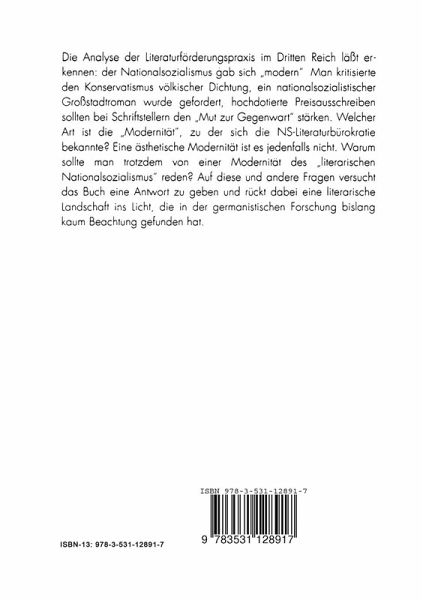 Die Analyse der Literaturförderungspraxis im Dritten Reich läßt erkennen: Der Nationalsozialismus gab sich "modern". Man kritisierte den Konservatismus völkischer Dichtung, ein nationalsozialistischer Großstadtroman wurde gefordert, hochdotierte Preisausschreiben sollten bei Schriftstellern den "Mut zur Gegenwart" stärken. Welcher Art ist die "Modernität", zu der sich die NS-Literaturbürokratie bekannte? Eine ästhetische Modernität ist es jedenfalls nicht. Warum sollte man trotzdem von einer Modernität des "literarischen Nationalsozialismus" reden? Auf diese und andere Fragen versucht das Buch eine Antwort zu geben und rückt dabei eine literarische Landschaft ins Licht, die in der germanistischen Forschung bislang kaum Beachtung gefunden hat.