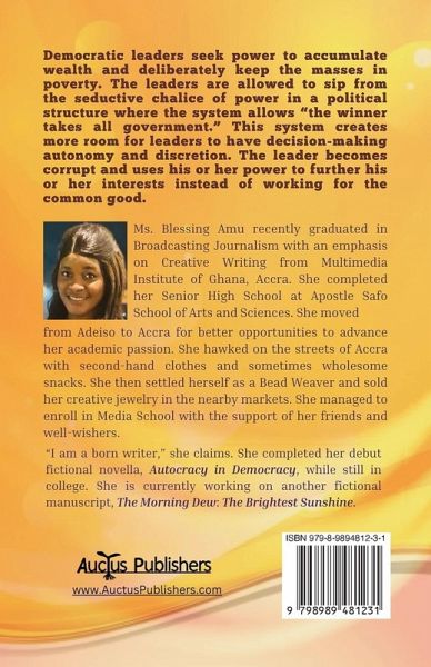 Autocracy in Democracy is a fictional story that depicts a story of corruption and narcissism. Democratic leaders seek power as a means to accumulate wealth and deliberately keep the masses in poverty. The leaders are allowed to sip from the seductive chalice of power in a political structure where the system allows "the winner takes all government." This system creates more room for leaders to have decision-making autonomy and lots of discretion. The leader becomes corrupt and uses his or her power to further his or her interests instead of working for the common good. In this beautifully well-written novel, the author gives us a space for dialogue and carefully narrates how Mrs. Akosua Nimako, the fearless founder of the Victory People's Party, wanted to build an empire for herself and her daughters, but was thrown out by the masses. The book ends with a loud voice that the power of the masses matters. Autocracy in Democracy is the debut novel by Ms. Amu.