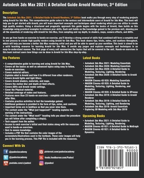 The Autodesk 3ds Max 2021: A Detailed Guide to Arnold Renderer, 3rd Edition book walks you through every step of rendering projects using Arnold for 3ds Max. This comprehensive guide caters to the novices and intermediate users of Arnold for 3ds Max. This book will help you to get started with Arnold, you will learn important concepts and techniques about rendering which you can utilize to create high quality renders. Using a structured and pragmatic approach this guide begins with the basics of Arnold, then builds on this knowledge using practical examples to enhance your skills. Each unit builds on the knowledge gained in the previous unit, showing you all the essentials of rendering with Arnold for 3ds Max, from sampling and ray depth, to shaders, maps, camera effects, and AOVs. As you go from hands-on exercise to hands-on exercise, you'll develop a strong arsenal of skills that combined will form a complete end to end process to create high quality renders using Arnold for 3ds Max. This book shares tips, tricks, notes, and cautions throughout, which will help you become a better 3ds Max rendering artist and you will be able to speed up your workflow. This book is aimed to be a solid teaching resource for learning Arnold for 3ds Max. It avoids any jargon and explains concepts and techniques in an easy-to-understand manner. The first page of every unit summarizes the topics that will be covered in the unit. Hands-on exercises in this book instruct users how things can be done in Arnold for 3ds Max step-by-step. Salient Features • A comprehensive guide to learning and using Arnold for 3ds Max. • Covers all the basics as well as advanced topics using easy to follow, hands-on exercises. • Covers material editors. • Explains what is Arnold and how it is different from other renderers. • Covers Arnold lights and light filters. • Covers Arnold shaders, materials, and maps. • Covers the motion blur and depth-of-field effects. • Covers AOVs and Arnold render settings. • Cover the Physical material. • Detailed coverage of nodes and features. • Features more than 23 hands-on exercises – complete with before and after files. • Contains practice activities to test the knowledge gained. • Additional guidance is provided in the form of tips, notes, and cautions. • Important terms are in boldface so that you never miss them. • The content under the "What just happened?" heading explains the working of the instructions. • The content under the "What next?" heading tells you about the procedure you will follow after completing a step(s). • Tech support from the author. • Access to each exercise's initial and final states along with the resources used in hands-on exercises. • Quiz to assess knowledge. • Includes a PDF file that contains the color images of the screenshots/illustrations used in the textbook. These color images will help you in the learning process. This PDF file is included with the resources. For more info, visit Padexi Academy's Website.