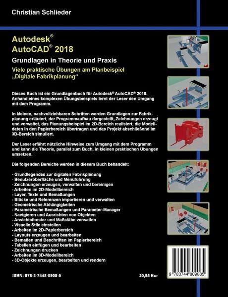 Dieses Buch ist ein Grundlagenbuch für Autodesk® AutoCAD® 2018. Anhand eines komplexen Übungsbeispiels lernt der Leser den Umgang mit dem Programm. In kleinen, nachvollziehbaren Schritten werden Grundlagen zur Fabrikplanung erläutert, der Programmaufbau dargestellt, Zeichnungen erzeugt und verwaltet, das Planungsbeispiel im 2D-Bereich realisiert, die Modelldaten in den Papierbereich übertragen und das Projekt abschließend im 3D-Bereich simuliert.Der Leser erfährt nützliche Hinweise zum Umgang mit dem Programm und kann die Theorie, parallel zum Buch, in kleinen praktischen Übungen umsetzen.Die folgenden Bereiche werden in diesem Buch behandelt:- Grundlegendes zur digitalen Fabrikplanung- Benutzeroberfläche und Menüführung- Zeichnungen erzeugen, verwalten und bereinigen- Arbeiten im 2D-Modellbereich- Layer, Texte und Bemaßungen- Blöcke und Referenzen importieren und verwalten- Geometrische Abhängigkeiten- Parametrische Bemaßungen und Parameter-Manager- Navigieren und Ausrichten vonObjekten- Ansichtsfenster und Maßstäbe verwalten- Visuelle Stile einstellen- Arbeiten im 2D-Papierbereich- Layouts erzeugen und bearbeiten- Bemaßen und Beschriften im Papierbereich- Tabellen einfügen und bearbeiten- Zeichnungen drucken- Arbeiten im 3D-Modellbereich- 3D-Objekte erzeugen, bearbeiten und rendern