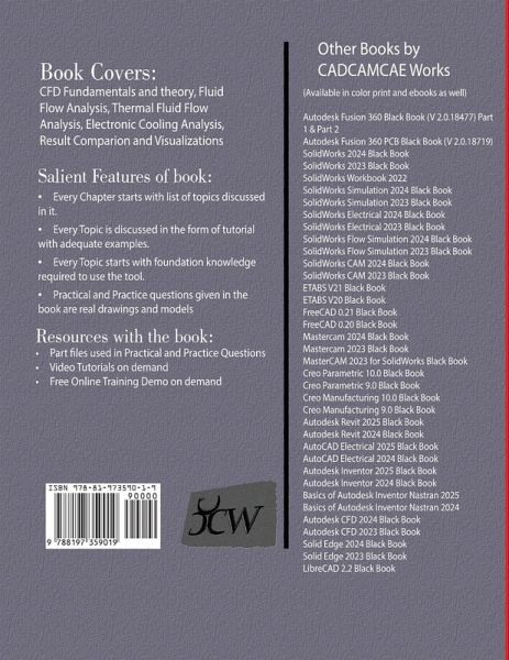 The Autodesk CFD 2024 Black Book, is New and updated 4th edition of our series on Autodesk CFD. The book is targeted for beginners of Autodesk CFD. This book covers the basic equations and terms of Fluid Dynamics theory. The book covers all the major tools of Flow Simulation modules like Fluid Flow, Thermal Fluid Flow, and Electronic Cooling modules. This book can be used as supplement to Fluid Dynamics course if your subject requires the application of Software for solving CFD problems. Some of the salient features of this book are: In-Depth explanation of concepts Every new topic of this book starts with the explanation of the basic concepts. In this way, the user becomes capable of relating the things with real world. Topics Covered Every chapter starts with a list of topics being covered in that chapter. In this way, the user can easy find the topic of his/her interest easily. Instruction through illustration The instructions to perform any action are provided by maximum number of illustrations so that the user can perform the actions discussed in the book easily and effectively. There are about 700 illustrations that make the learning process effective. Tutorial point of view The book explains the concepts through the tutorial to make the understanding of users firm and long lasting. Practical of the book are based on real world projects. For Faculty If you are a faculty member, then you can ask for video tutorials on any of the topic, exercise, tutorial, or concept. As faculty, you can register on our website to get electronic desk copies of our latest books, self-assessment, and solution of practical. Faculty resources are available in the Faculty Member page of our website (www.cadcamcaeworks.com) once you login. Note that faculty registration approval is manual and it may take two days for approval before you can access the faculty website.